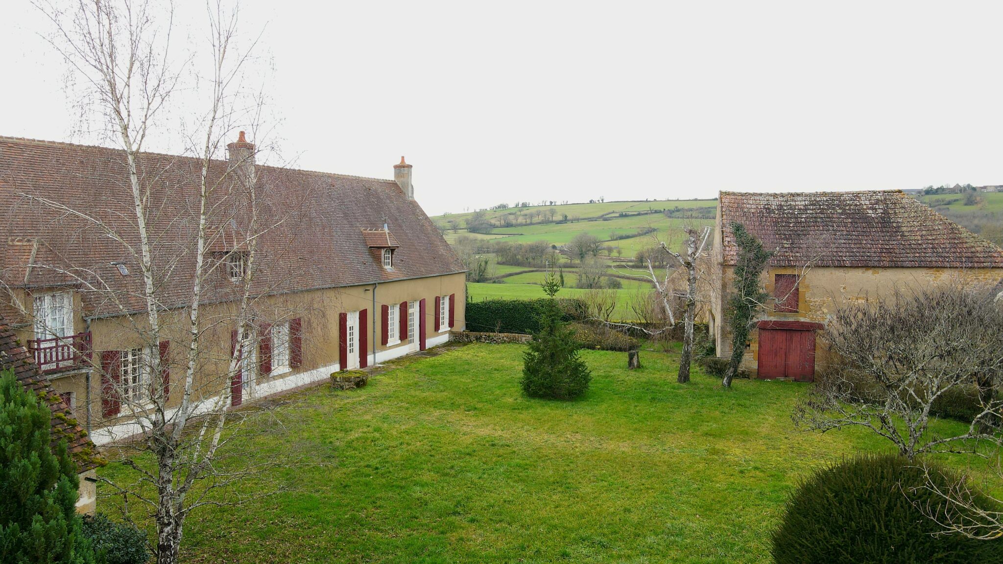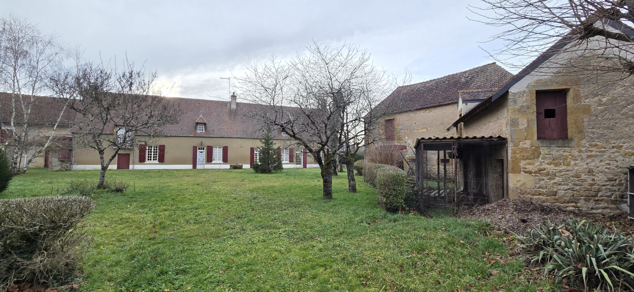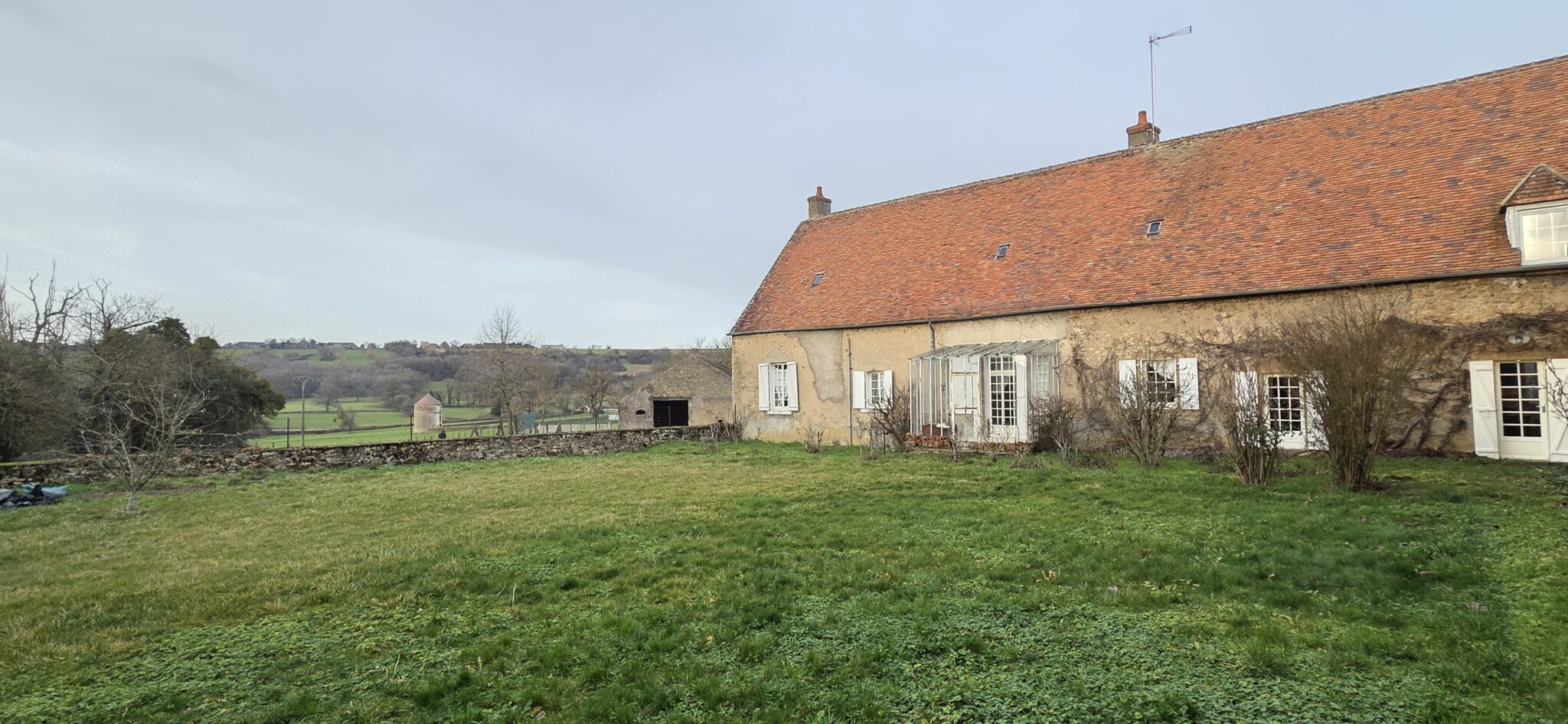 Réf. 2973 – Bourgogne Nord, région CORBIGNY, dans hameau à l’abri des regards, BEL ENSEMBLE IMMOBILIER avec nombreuses dépendances, cours intérieures et terrain clos de murs en grande partie. Maison d’habitation de 200 m², sol tomettes et carrelage, poutres, cheminées, greniers, caves voûtées. Cuisine 17 m², salle à manger 45 m² (cheminée avec poêle à bois), salon 26 m² (cheminée) avec véranda et sortie sur jardin, trois chambres (18 m², 19 m² et 9 m²) dont deux avec cheminée, pièce de transition avec lavabo et WC, buanderie avec WC et chaufferie. Accès à l’étage par escalier bois : palier-couloir, une grande chambre 26 m² avec grenier au-dessus, salle d’eau-WC et immense grenier 138 m². Toiture en petites tuiles de Bourgogne, chauffage central au fioul, huisseries simple vitrage, assainissement individuel. Ancien bâtiment agricole 210 m², composé de deux étables doubles avec fenils au-dessus, grange, atelier. Adossée à ce bâtiment, stabulation de 4 travées. Autres dépendances : remise 12 m² avec grenier, ancienne pièces à fours 22 m², grenier, trois poulaillers avec greniers et autre bâtiment à usage de garage 56 m² avec grenier au-dessus. Deux entrées, deux cours intérieures, l’ensemble sur 2 744 m² clos de murs en grande partie, au grand calme. Environnement vallonné et boisé, commerces et gare à environ 10 minutes en voiture.