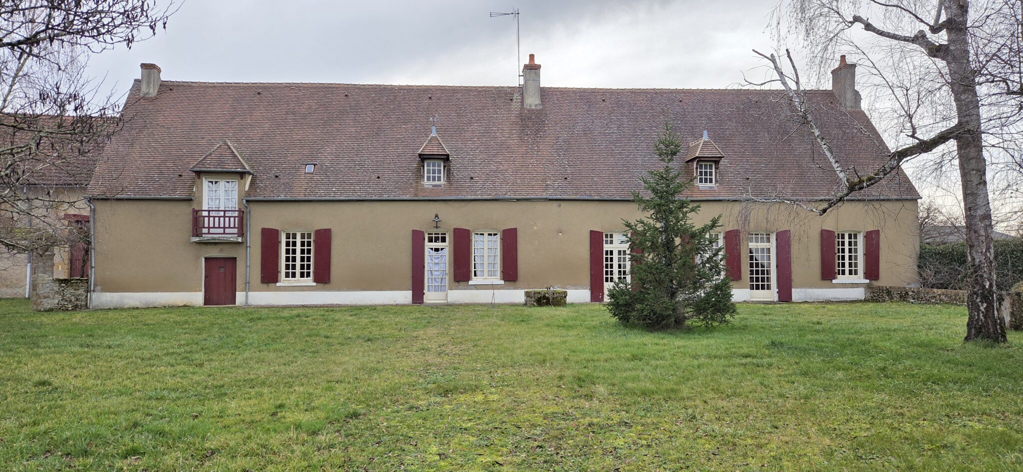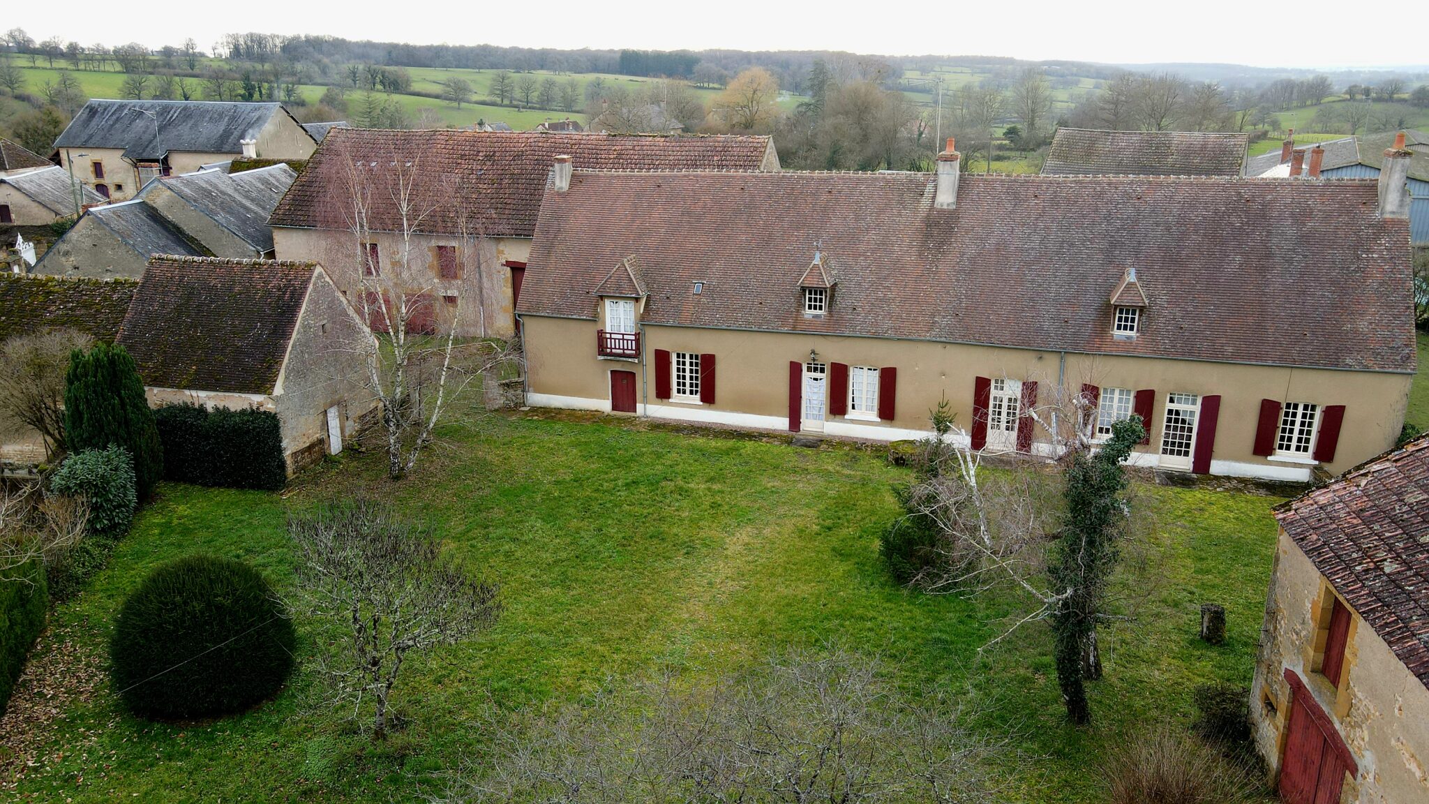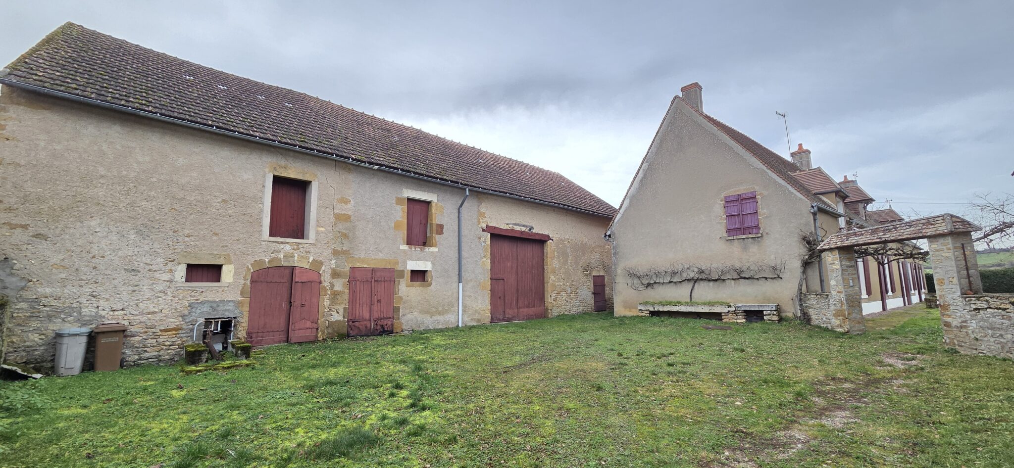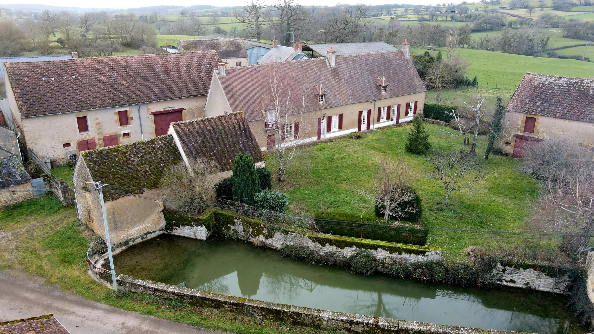 Réf. 2973 – Bourgogne Nord, région CORBIGNY, dans hameau à l’abri des regards, BEL ENSEMBLE IMMOBILIER avec nombreuses dépendances, cours intérieures et terrain clos de murs en grande partie. Maison d’habitation de 200 m², sol tomettes et carrelage, poutres, cheminées, greniers, caves voûtées. Cuisine 17 m², salle à manger 45 m² (cheminée avec poêle à bois), salon 26 m² (cheminée) avec véranda et sortie sur jardin, trois chambres (18 m², 19 m² et 9 m²) dont deux avec cheminée, pièce de transition avec lavabo et WC, buanderie avec WC et chaufferie. Accès à l’étage par escalier bois : palier-couloir, une grande chambre 26 m² avec grenier au-dessus, salle d’eau-WC et immense grenier 138 m². Toiture en petites tuiles de Bourgogne, chauffage central au fioul, huisseries simple vitrage, assainissement individuel. Ancien bâtiment agricole 210 m², composé de deux étables doubles avec fenils au-dessus, grange, atelier. Adossée à ce bâtiment, stabulation de 4 travées. Autres dépendances : remise 12 m² avec grenier, ancienne pièces à fours 22 m², grenier, trois poulaillers avec greniers et autre bâtiment à usage de garage 56 m² avec grenier au-dessus. Deux entrées, deux cours intérieures, l’ensemble sur 2 744 m² clos de murs en grande partie, au grand calme. Environnement vallonné et boisé, commerces et gare à environ 10 minutes en voiture.