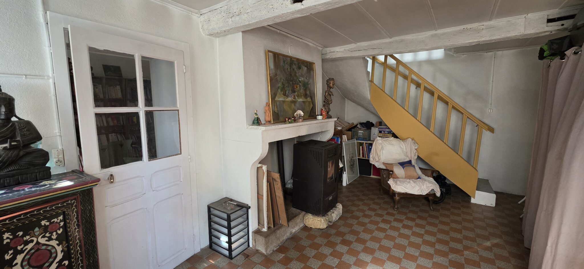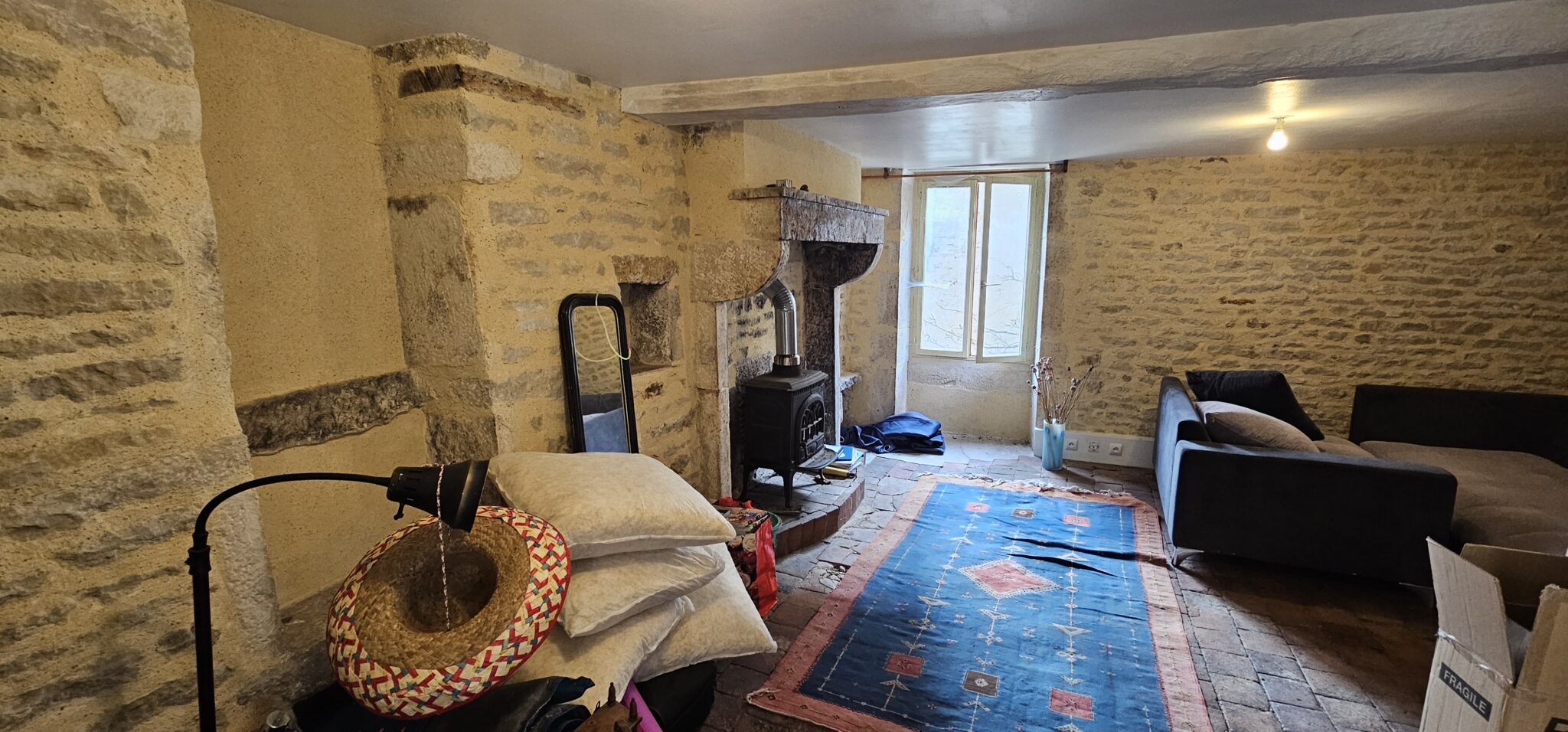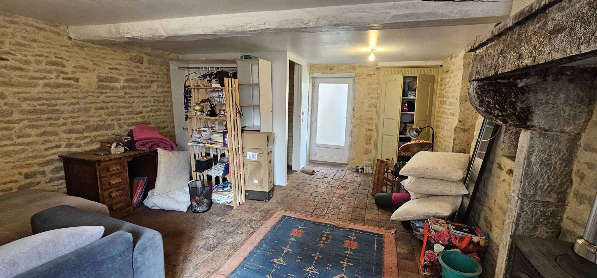 Entrée sur cuisine 16 m², tomettes, cheminée avec poêle à bois, salle d’eau-WC (sanibroyeur), bureau, salon 19 m², carrelage, cheminée. A l’étage, une belle chambre 16 m². Accès indépendant une jolie pièce 24 m², WC (sanibroyeur), lavabo, tomettes, cheminée avec poêle à bois.