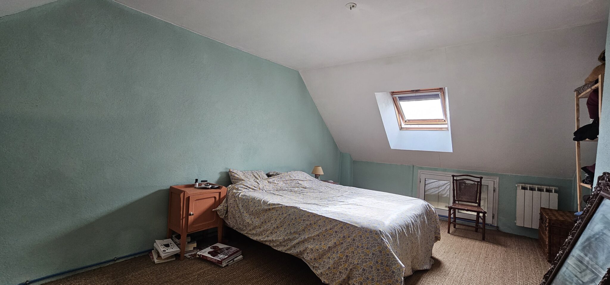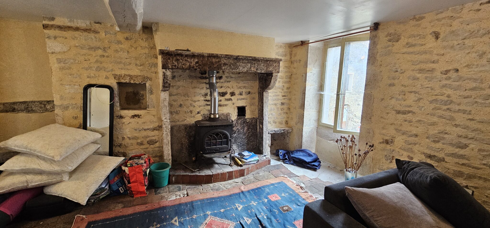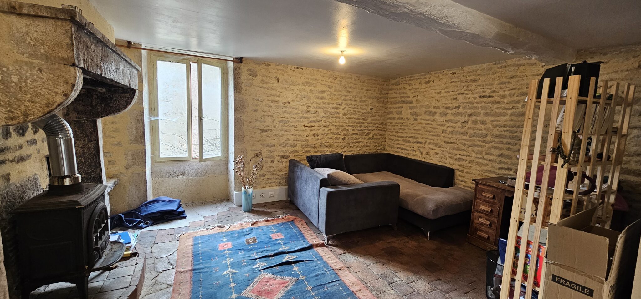Entrée sur cuisine 16 m², tomettes, cheminée avec poêle à bois, salle d’eau-WC (sanibroyeur), bureau, salon 19 m², carrelage, cheminée. A l’étage, une belle chambre 16 m². Accès indépendant une jolie pièce 24 m², WC (sanibroyeur), lavabo, tomettes, cheminée avec poêle à bois.