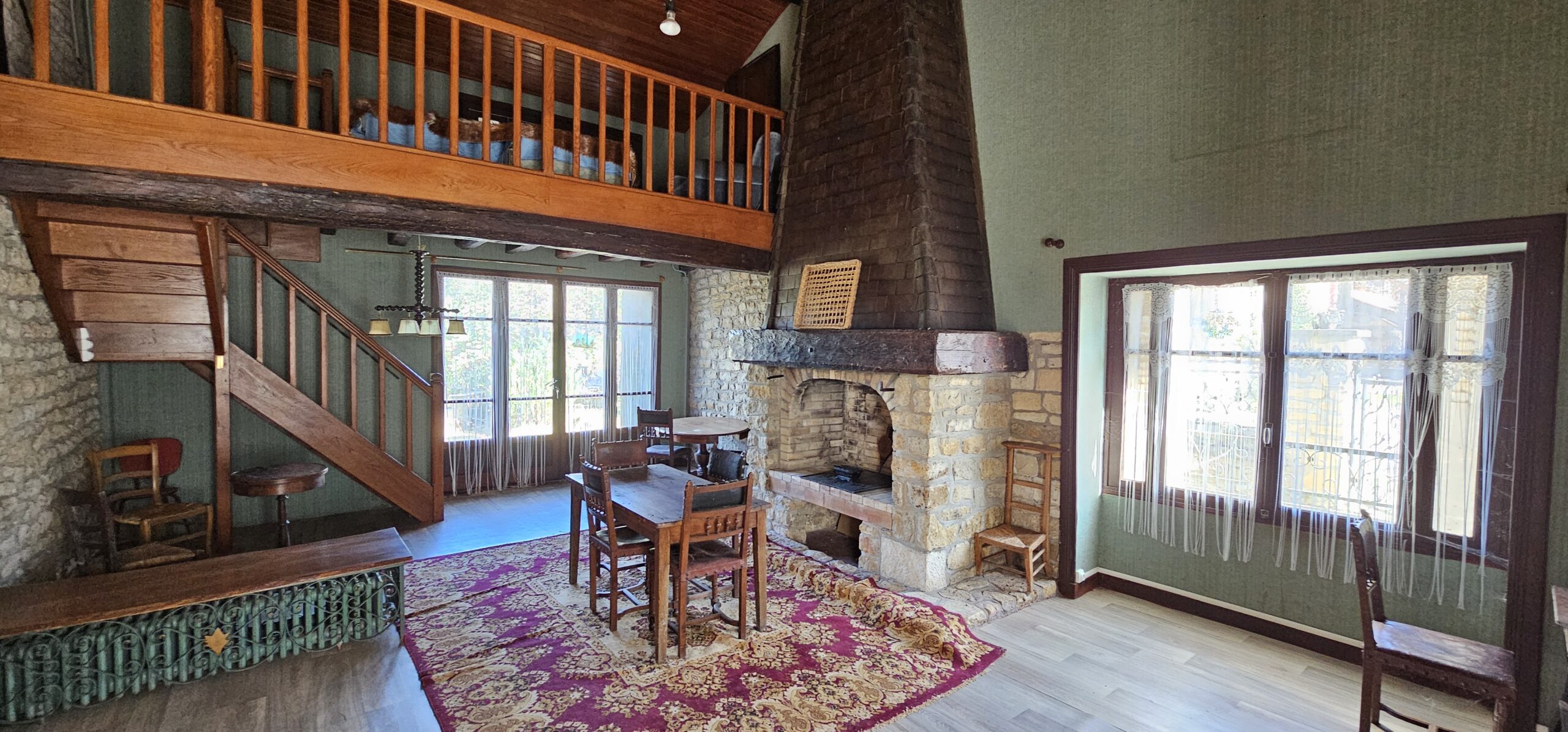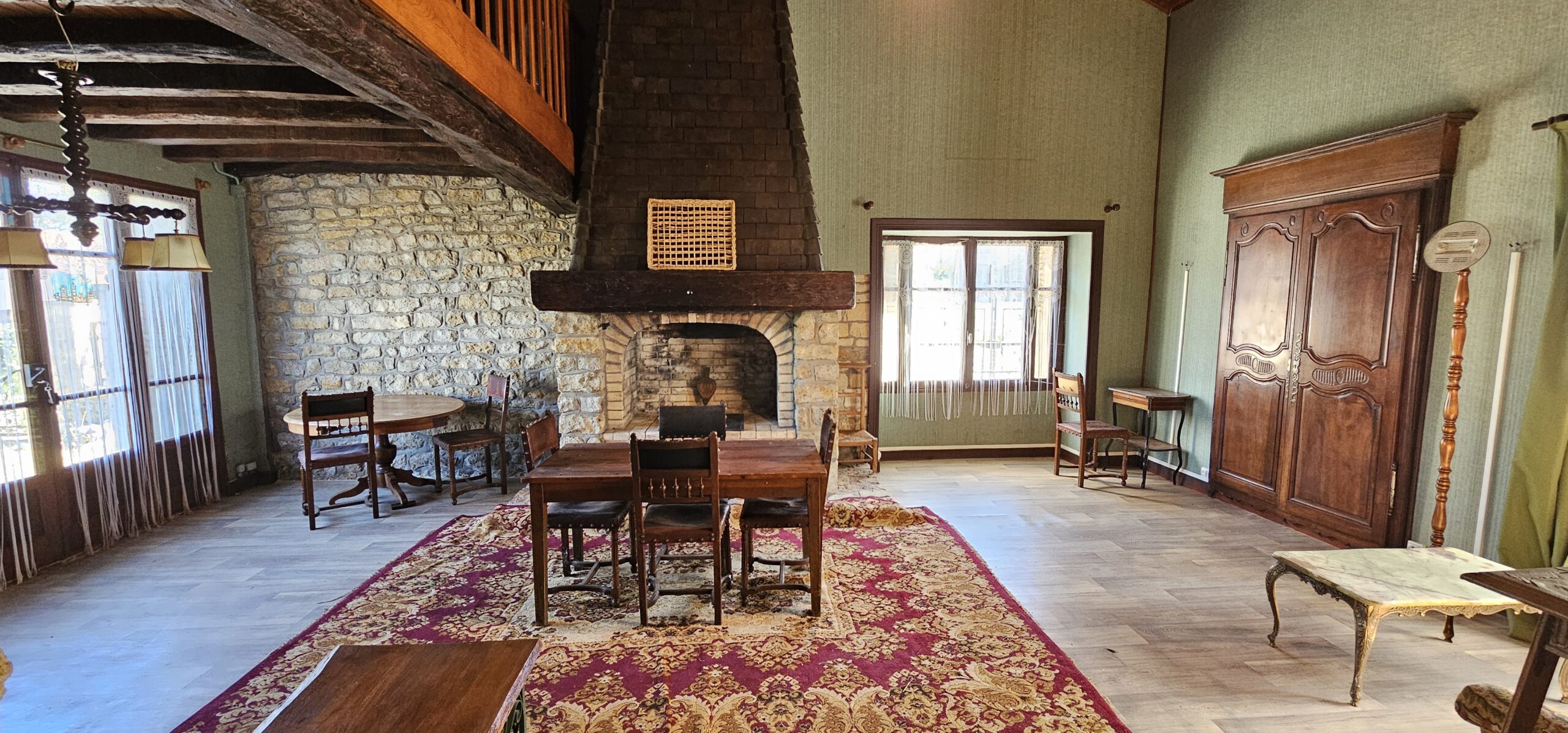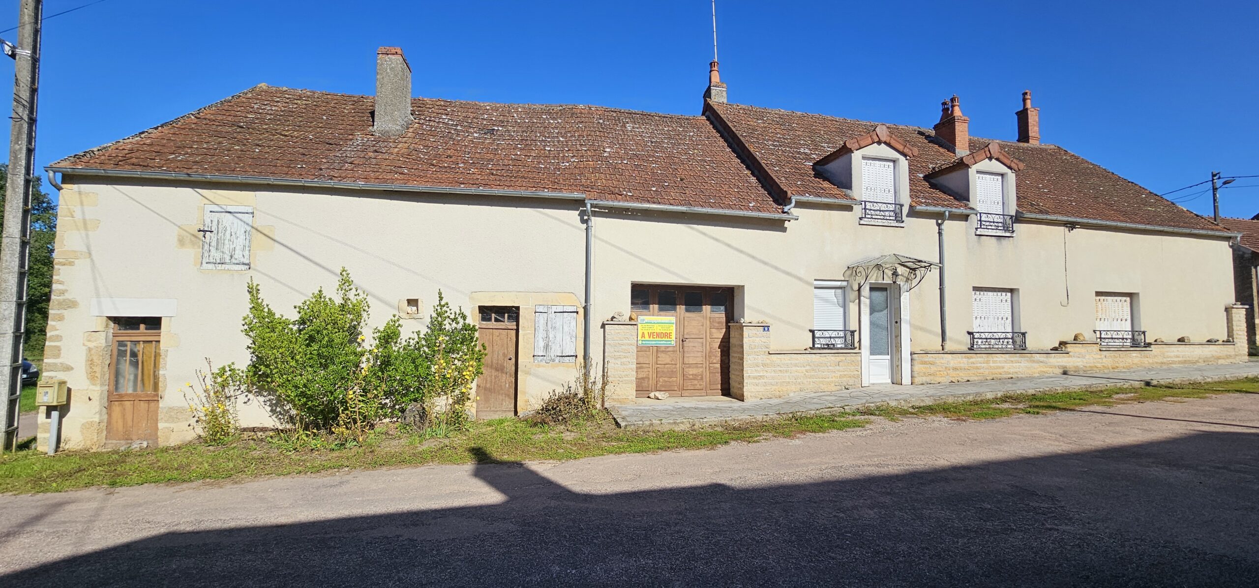 Réf. 2893 – Région TANNAY, maison de village, indépendante, 148 m² habitables : pièce d’entrée carrelée 16 m² (poutres, cheminée, fenêtre double vitrage avec volet électrique), cuisine aménagée carrelée 14 m² (poutres, fenêtre double vitrage avec volet électrique), salon carrelé 14 m² (poutres, cheminée ouverte), salle à manger 34 m² (poutres, cheminée ouverte, lino sur dalle béton) avec mezzanine, salle de bains-WC (sanibroyeur) 7 m², dégagement avec montée d’escalier bois pour accéder au premier étage : palier (parquet), trois chambres (parquet), salle de bains, WC, lingerie. Cellier, véranda côté jardin, garage 16 m². Installation chauffage central fuel (chaudière à réviser), huisseries en simple vitrage. Travaux de rénovation intérieure à prévoir. PLUS autre ancienne maison (non habitable) attenante : deux pièces 19 m² et 16 m² (sol en pierre, tomettes, four à pain, cheminée), remise avec sortie sur jardin et caveron voûté. Grenier au-dessus 60 m² environ, dalle ciment au sol. Remise-hangar 12 m², l’ensemble sur 840 m² de terrain clos, avec puits et pompe à l’ancienne. Taxe foncière (2023) : 1 213,00 €.